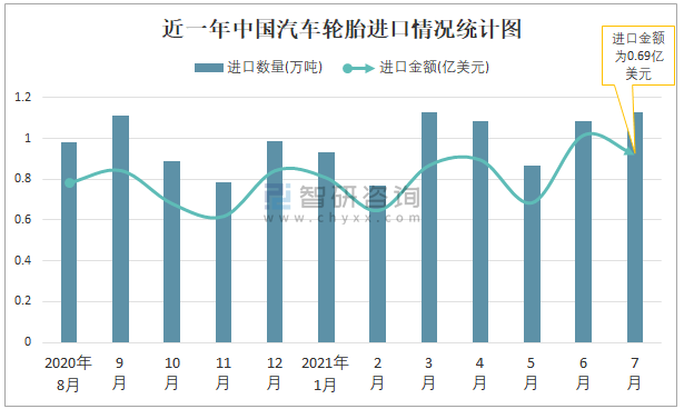 根據(jù)中國海關數(shù)據(jù)顯示:2021年7月中國汽車輪胎進口數(shù)量為1.13萬噸,同比增長12.7%,進口金額為0.69億美元,同比增長20.5%,2021年7月中國汽車輪胎出口數(shù)量為47.3萬噸,同比下降12.2%,出口金額為11.28億美元,同比下降1.3%;2021年1-7月中國汽車輪胎進口數(shù)量為7萬噸,進口金額為4.39億美元,出口數(shù)量為344.83萬噸,出口金額為78.84億美元。