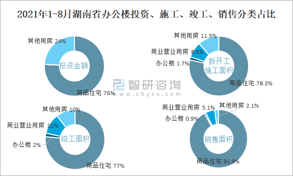 2021年1-8月湖南省辦公樓投資、施工、竣工、銷(xiāo)售分類(lèi)占比
