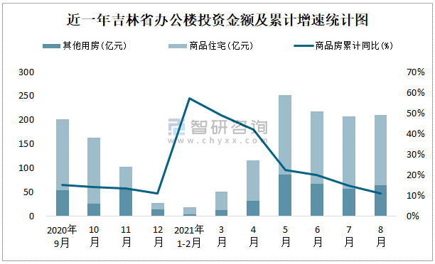 根據國家統計局數據統計可知:2021年8月吉林省房地產開發投資商品房投資金額為211.01億元,其中包括辦公樓、商業營業用房等其他用房63.78億元(注:辦公樓、商業營業用房未分開統計);2021年1-8月吉林省房地產開發投資包括辦公樓在內的其他用房累計金額為321.41億元。