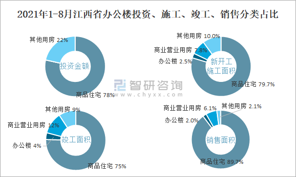 根據(jù)國家統(tǒng)計局數(shù)據(jù)統(tǒng)計可知:2021年1-8月江西省房地產(chǎn)開發(fā)企業(yè)在包括辦公樓在內(nèi)的其他用房投資金額占比為21.5%(注:只有投資金額中其他用房包含辦公樓、商業(yè)營業(yè)用房),辦公樓的新開工面積與竣工面積所占比重差異不大,從銷售面積來看,辦公樓銷售面積占比少于商業(yè)營業(yè)用房銷售面積占比。