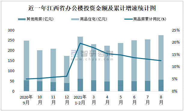 根據(jù)國家統(tǒng)計局數(shù)據(jù)統(tǒng)計可知:2021年8月江西省房地產(chǎn)開發(fā)投資商品房投資金額為275.04億元,其中包括辦公樓、商業(yè)營業(yè)用房等其他用房57.04億元(注:辦公樓、商業(yè)營業(yè)用房未分開統(tǒng)計);2021年1-8月江西省房地產(chǎn)開發(fā)投資包括辦公樓在內(nèi)的其他用房累計金額為374.96億元。