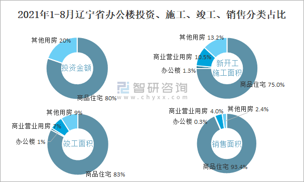 根據國家統計局數據統計可知:2021年1-8月遼寧省房地產開發企業在包括辦公樓在內的其他用房投資金額占比為19.7%(注:只有投資金額中其他用房包含辦公樓、商業營業用房),辦公樓的新開工面積與竣工面積所占比重差異不大,從銷售面積來看,辦公樓銷售面積占比少于商業營業用房銷售面積占比。