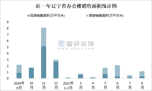 根據國家統計局數據可知:2021年8月遼寧省辦公樓銷售面積為1.13萬平方米(其中銷售現房0.3萬平方米,期房0.83萬平方米);2021年1-8月遼寧省辦公樓累計銷售面積為6.43萬平方米;近一年遼寧省辦公樓期房銷售面積遠高于現房銷售面積。