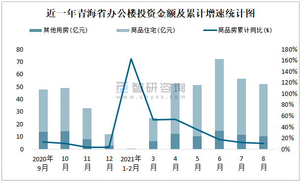 根據國家統計局數據統計可知:2021年8月青海省房地產開發投資商品房投資金額為52.09億元,其中包括辦公樓、商業營業用房等其他用房10.31億元(注:辦公樓、商業營業用房未分開統計);2021年1-8月青海省房地產開發投資包括辦公樓在內的其他用房累計金額為65.76億元。