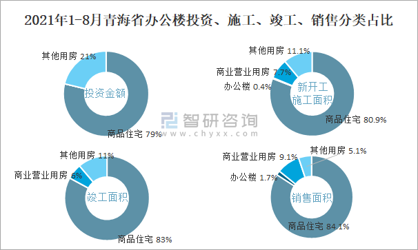 根據國家統計局數據統計可知:2021年1-8月青海省房地產開發企業在包括辦公樓在內的其他用房投資金額占比為21.2%(注:只有投資金額中其他用房包含辦公樓、商業營業用房),辦公樓的新開工面積與竣工面積所占比重差異不大,從銷售面積來看,辦公樓銷售面積占比少于商業營業用房銷售面積占比。