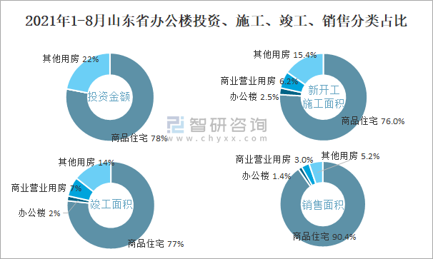 根據國家統計局數據統計可知:2021年1-8月山東省房地產開發企業在包括辦公樓在內的其他用房投資金額占比為22%(注:只有投資金額中其他用房包含辦公樓、商業營業用房),辦公樓的新開工面積與竣工面積所占比重差異不大,從銷售面積來看,辦公樓銷售面積占比少于商業營業用房銷售面積占比。