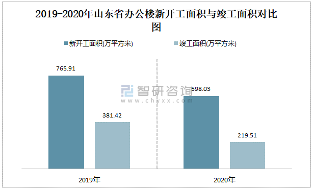 2019-2020年山東省辦公樓新開工面積與竣工面積對比圖