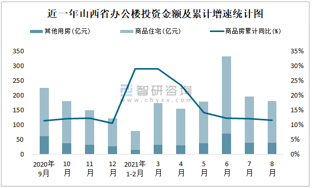 根據(jù)國家統(tǒng)計局?jǐn)?shù)據(jù)統(tǒng)計可知:2021年8月山西省房地產(chǎn)開發(fā)投資商品房投資金額為179.67億元,其中包括辦公樓、商業(yè)營業(yè)用房等其他用房37.91億元(注:辦公樓、商業(yè)營業(yè)用房未分開統(tǒng)計);2021年1-8月山西省房地產(chǎn)開發(fā)投資包括辦公樓在內(nèi)的其他用房累計金額為259.12億元。