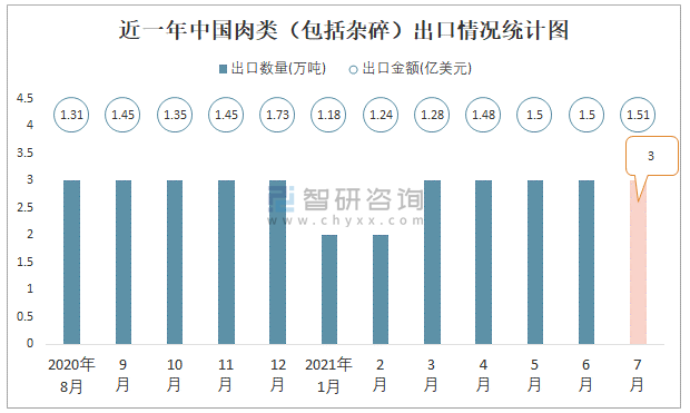 近一年中國肉類(包括雜碎)出口情況統計圖