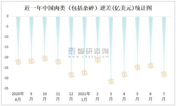 近一年中國肉類(包括雜碎)逆差(億美元)統計圖