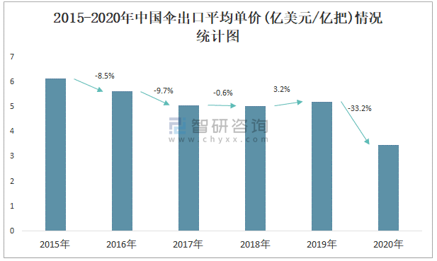 2015-2020年中國傘出口平均單價(jià)(億美元/億把)情況統(tǒng)計(jì)圖