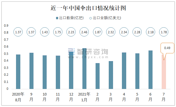 2021年7月中國傘出口數(shù)量和出口金額分別為0.49億把和1.78億美元