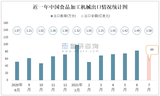 根據(jù)中國(guó)海關(guān)數(shù)據(jù)顯示:2021年7月中國(guó)食品加工機(jī)械進(jìn)口數(shù)量為1萬(wàn)臺(tái),同比增長(zhǎng)56.4%,進(jìn)口金額為0.66億美元,同比增長(zhǎng)17.3%,2021年7月中國(guó)食品加工機(jī)械出口數(shù)量為69萬(wàn)臺(tái),同比增長(zhǎng)24.1%,出口金額為1.58億美元,同比增長(zhǎng)41.1%;2021年1-7月中國(guó)食品加工機(jī)械進(jìn)口數(shù)量為8萬(wàn)臺(tái),進(jìn)口金額為4.03億美元,出口數(shù)量為491萬(wàn)臺(tái),出口金額為9.45億美元。