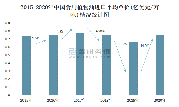 2015-2020年中國食用植物油進口平均單價(億美元/萬噸)情況統(tǒng)計圖