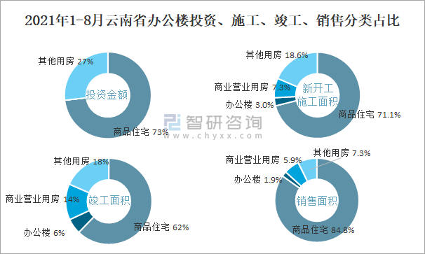 根據國家統計局數據統計可知:2021年1-8月云南省房地產開發企業在包括辦公樓在內的其他用房投資金額占比為26.8%(注:只有投資金額中其他用房包含辦公樓、商業營業用房),辦公樓的新開工面積與竣工面積所占比重差異不大,從銷售面積來看,辦公樓銷售面積占比少于商業營業用房銷售面積占比。