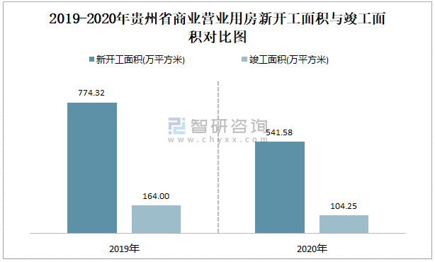 2019-2020年貴州省商業(yè)營業(yè)用房新開工面積與竣工面積對比圖