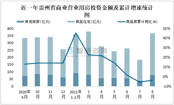 近一年貴州省商業(yè)營業(yè)用房投資金額及累計增速統(tǒng)計圖