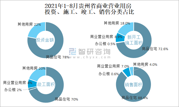 2021年1-8月貴州省商業(yè)營業(yè)用房投資、施工、竣工、銷售分類占比
