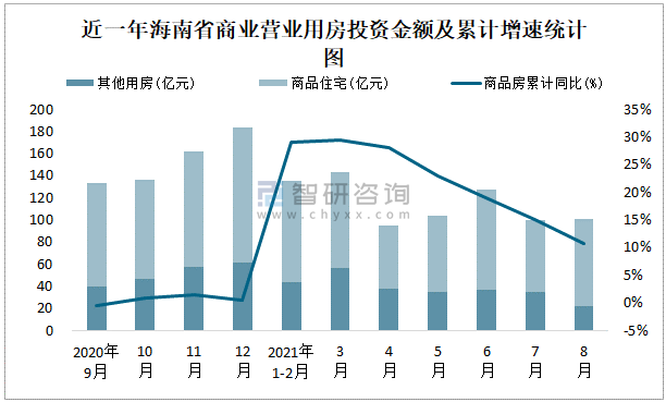 根據國家統計局數據統計可知:2021年8月海南省房地產開發投資商品房投資金額為100.88億元,其中包括辦公樓、商業營業用房等其他用房21.67億元(注:辦公樓、商業營業用房未分開統計);2021年1-8月海南省房地產開發投資包括商業營業用房在內的其他用房累計金額為265.8億元。