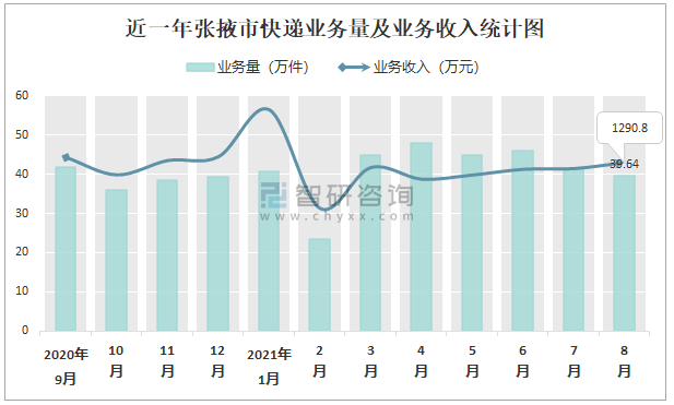 近一年張掖市快遞業務量及業務收入統計圖