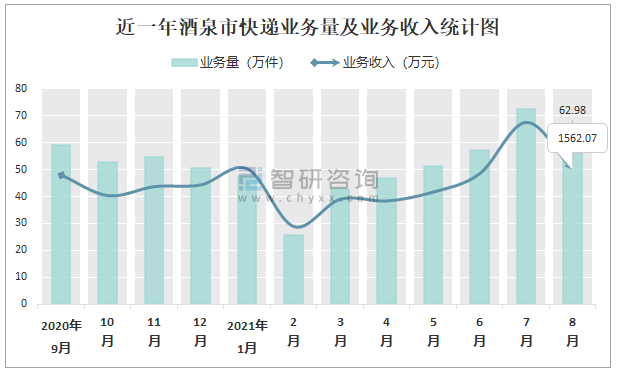 2021年8月酒泉市快遞業(yè)務量與業(yè)務收入分別為62.98萬件和1562.07萬元