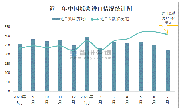 根據中國海關數據顯示:2021年7月中國紙漿進口數量為225萬噸,同比下降10.8%,進口金額為17.6億美元,同比增長34.3%,2021年1-7月中國紙漿進口數量為1807萬噸,進口金額為115.01億美元。