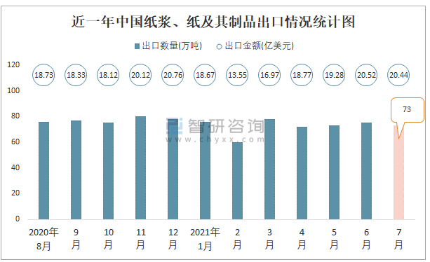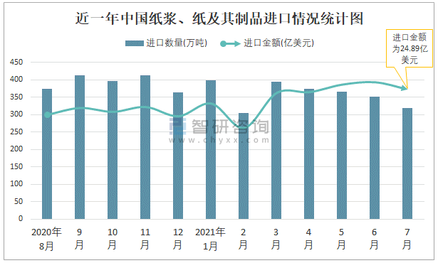 2021年7月中國紙漿、紙及其制品進出口數量分別為319萬噸和73萬噸