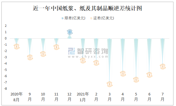 近一年中國紙漿、紙及其制品順逆差統計圖