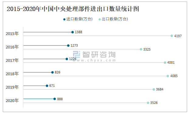 2015-2020年中國中央處理部件進出口數(shù)量統(tǒng)計圖
