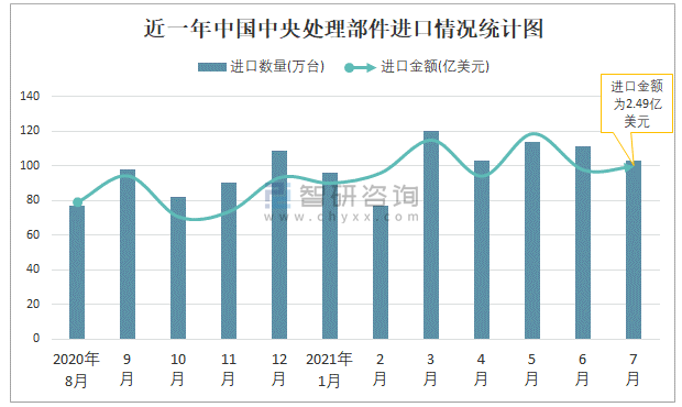 根據(jù)中國海關數(shù)據(jù)顯示:2021年7月中國中央處理部件進口數(shù)量為103萬臺,同比增長58.9%,進口金額為2.49億美元,同比增長80.7%,2021年7月中國中央處理部件出口數(shù)量為366萬臺,同比增長26.6%,出口金額為18.03億美元,同比增長45.8%;2021年1-7月中國中央處理部件進口數(shù)量為725萬臺,進口金額為17.75億美元,出口數(shù)量為2248萬臺,出口金額為107.71億美元。