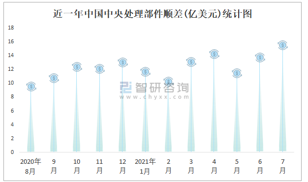 近一年中國中央處理部件順差(億美元)統(tǒng)計圖