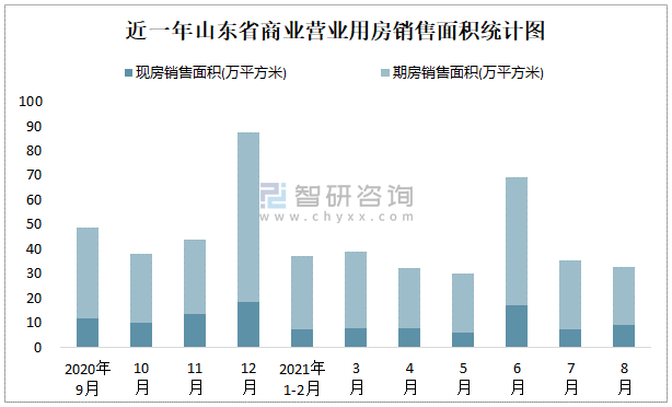 2021年8月山東省商業營業用房銷售面積為32.6萬平方米(現房銷售面積占比28.34%)