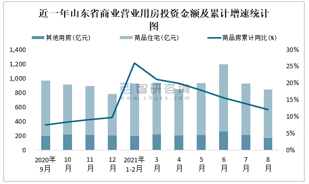 根據國家統計局數據統計可知:2021年8月山東省房地產開發投資商品房投資金額為844.68億元,其中包括辦公樓、商業營業用房等其他用房169.28億元(注:辦公樓、商業營業用房未分開統計);2021年1-8月山東省房地產開發投資包括商業營業用房在內的其他用房累計金額為1452.97億元。