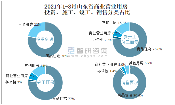 根據國家統計局數據統計可知:2021年1-8月山東省房地產開發企業在包括商業營業用房在內的其他用房投資金額占比為22%(注:只有投資金額中其他用房包含辦公樓、商業營業用房),商業營業用房的新開工面積與竣工面積所占比重差異不大,從銷售面積來看,商業營業用房銷售面積占比高于辦公樓銷售面積占比。