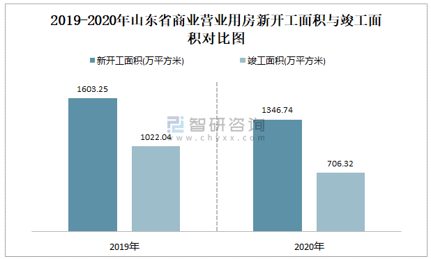 2019-2020年山東省商業營業用房新開工面積與竣工面積對比圖