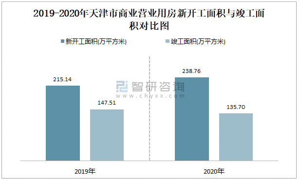 2019-2020年天津市商業(yè)營業(yè)用房新開工面積與竣工面積對比圖