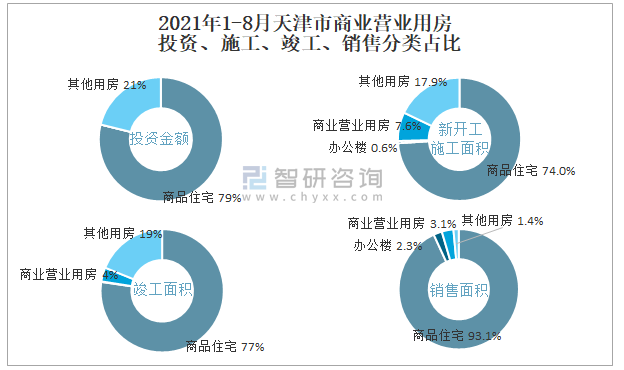 根據(jù)國家統(tǒng)計(jì)局?jǐn)?shù)據(jù)統(tǒng)計(jì)可知:2021年1-8月天津市房地產(chǎn)開發(fā)企業(yè)在包括商業(yè)營業(yè)用房在內(nèi)的其他用房投資金額占比為21.2%(注:只有投資金額中其他用房包含辦公樓、商業(yè)營業(yè)用房),商業(yè)營業(yè)用房的新開工面積與竣工面積所占比重差異不大,從銷售面積來看,商業(yè)營業(yè)用房銷售面積占比高于辦公樓銷售面積占比。
