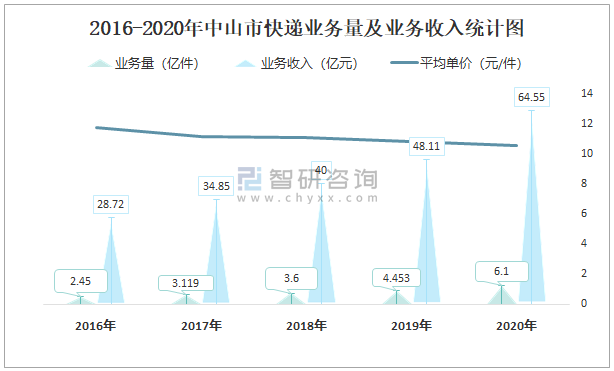 2016-2020年中山市快遞業務量及業務收入統計圖