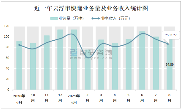 近一年云浮市快遞業(yè)務(wù)量及業(yè)務(wù)收入統(tǒng)計(jì)圖
