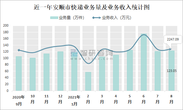 近一年安順市快遞業(yè)務(wù)量及業(yè)務(wù)收入統(tǒng)計(jì)圖