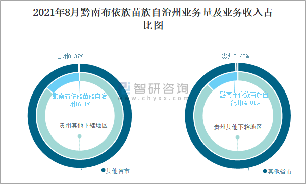 根據各省市郵政局數據可知:2021年8月黔南布依族苗族自治州快遞業務量占貴州快遞業務量的16.1%,貴州快遞業務量占全國快遞業務量的0.38%;2021年8月黔南布依族苗族自治州快遞業務收入占貴州快遞業務收入的14.01%,貴州快遞業務收入占全國快遞業務收入的0.67%。