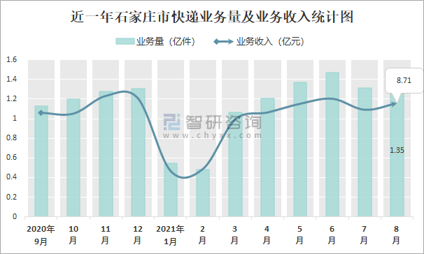 近一年石家莊市快遞業(yè)務(wù)量及業(yè)務(wù)收入統(tǒng)計(jì)圖
