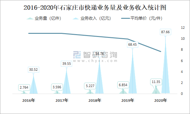 根據(jù)各省市郵政局?jǐn)?shù)據(jù)可知:2021年8月石家莊市快遞業(yè)務(wù)量為13475.6萬件,業(yè)務(wù)收入為87073.5萬元;2021年1-8月石家莊市快遞累計(jì)業(yè)務(wù)量為88000萬件,同比增長37.5%,累計(jì)業(yè)務(wù)收入為573000萬元,同比增長7.1%;2016-2020年石家莊市快遞業(yè)務(wù)量與業(yè)務(wù)收入均逐年遞增,平均單價(jià)逐年遞減。