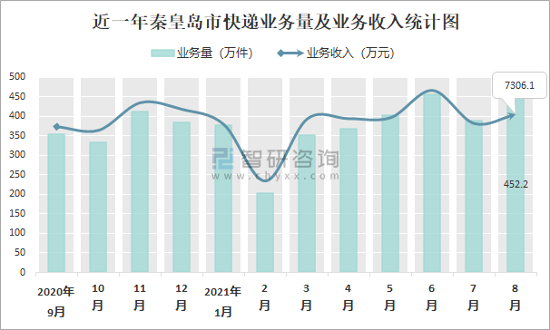 2021年8月秦皇島市快遞業(yè)務(wù)量與業(yè)務(wù)收入分別為452.2萬件和7306.1萬元