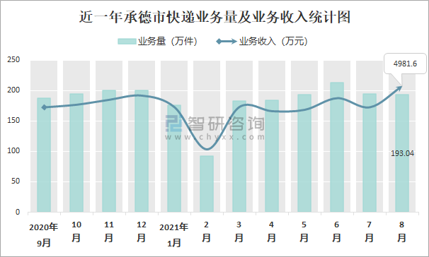 2021年8月承德市快遞業務量與業務收入分別為193.04萬件和4981.6萬元