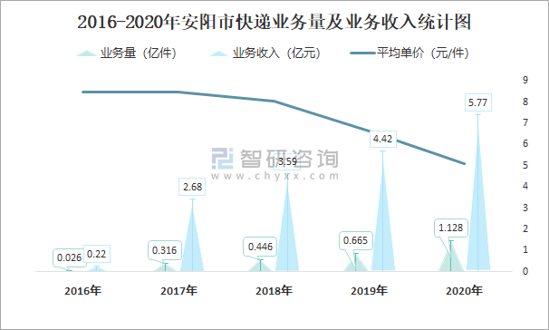2016-2020年安陽市快遞業務量及業務收入統計圖