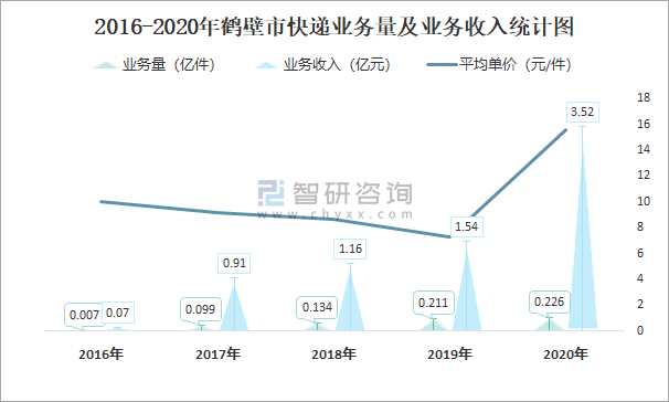 2016-2020年鶴壁市快遞業(yè)務(wù)量及業(yè)務(wù)收入統(tǒng)計圖