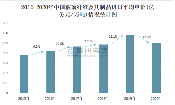 2015-2020年中國玻璃纖維及其制品進口平均單價(億美元/萬噸)統計圖