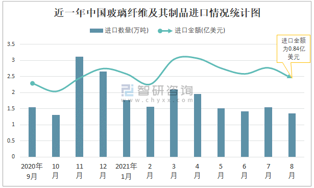 2021年8月中國玻璃纖維及其制品進口數量和進口金額分別為1.35萬噸和0.84億美元