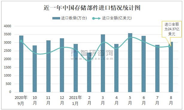 根據中國海關數據顯示:2021年8月中國存儲部件進口數量為3058萬臺,同比下降2.2%,進口金額為24.37億美元,同比增長6.7%,2021年8月中國存儲部件出口數量為2258萬臺,同比增長2.3%,出口金額為15.28億美元,同比增長6.3%;2021年1-8月中國存儲部件進口數量為24669萬臺,進口金額為192.63億美元,出口數量為18209萬臺,出口金額為121.29億美元。